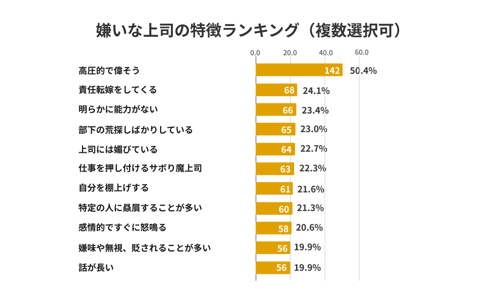 上記の画像はJob総研が調査した「嫌いな上司の特徴ランキング」では高圧的で偉そう、責任転嫁をするなど自己中心的な考えを持つ上司が多いといえます。